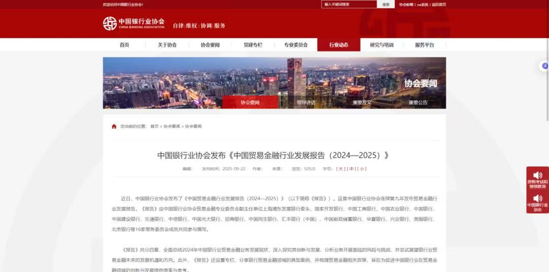 近日,中国银行业协会发布了《中国贸易金融行业发展报告(2024—2025)》(以下简称《报告》)。这是中国银行业协会连续第九年发布贸易金融行业发展报告。《报告》由中国银行业协会贸易金融专业委员会副主任单位上海浦东发展银行牵头,国家开发银行、中国工商银行、中国农业银行、中国银行、中国建设银行、交通银行、中信银行、中国光大银行、招商银行、中国民生银行、汇丰银行(中国)、中国邮政储蓄银行、华夏银行、兴业银行、渤海银行、北京银行等16家常务委员会成员共同参与撰写。