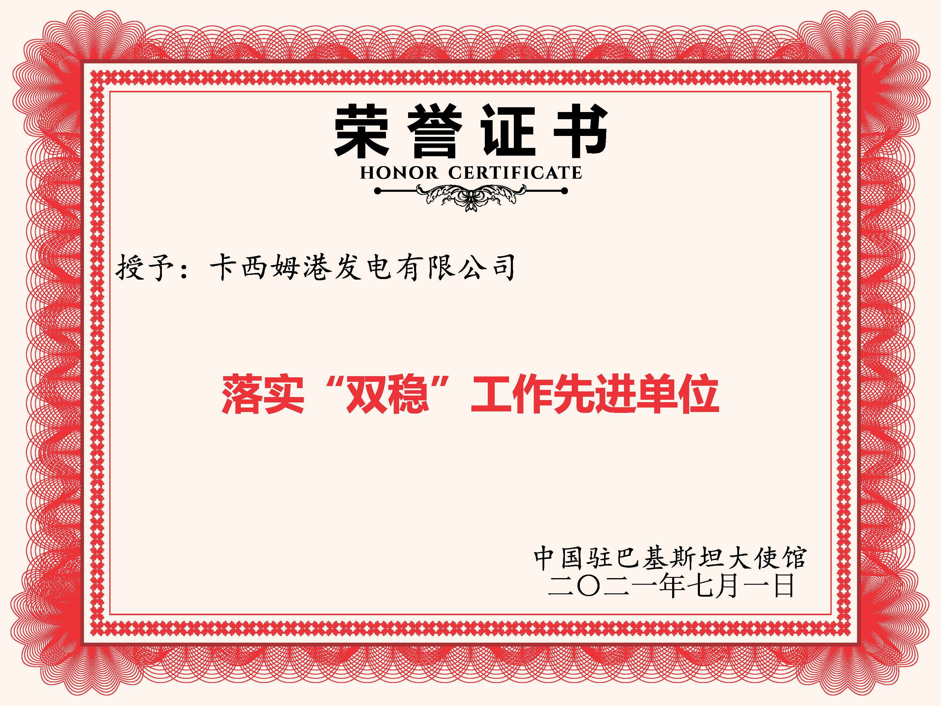 8月27日,中国驻巴基斯坦大使馆授予中国电建卡西姆港发电有限公司“落实‘双稳’”工作先进单位”荣誉,对疫情期间的工作成果给予高度肯定。