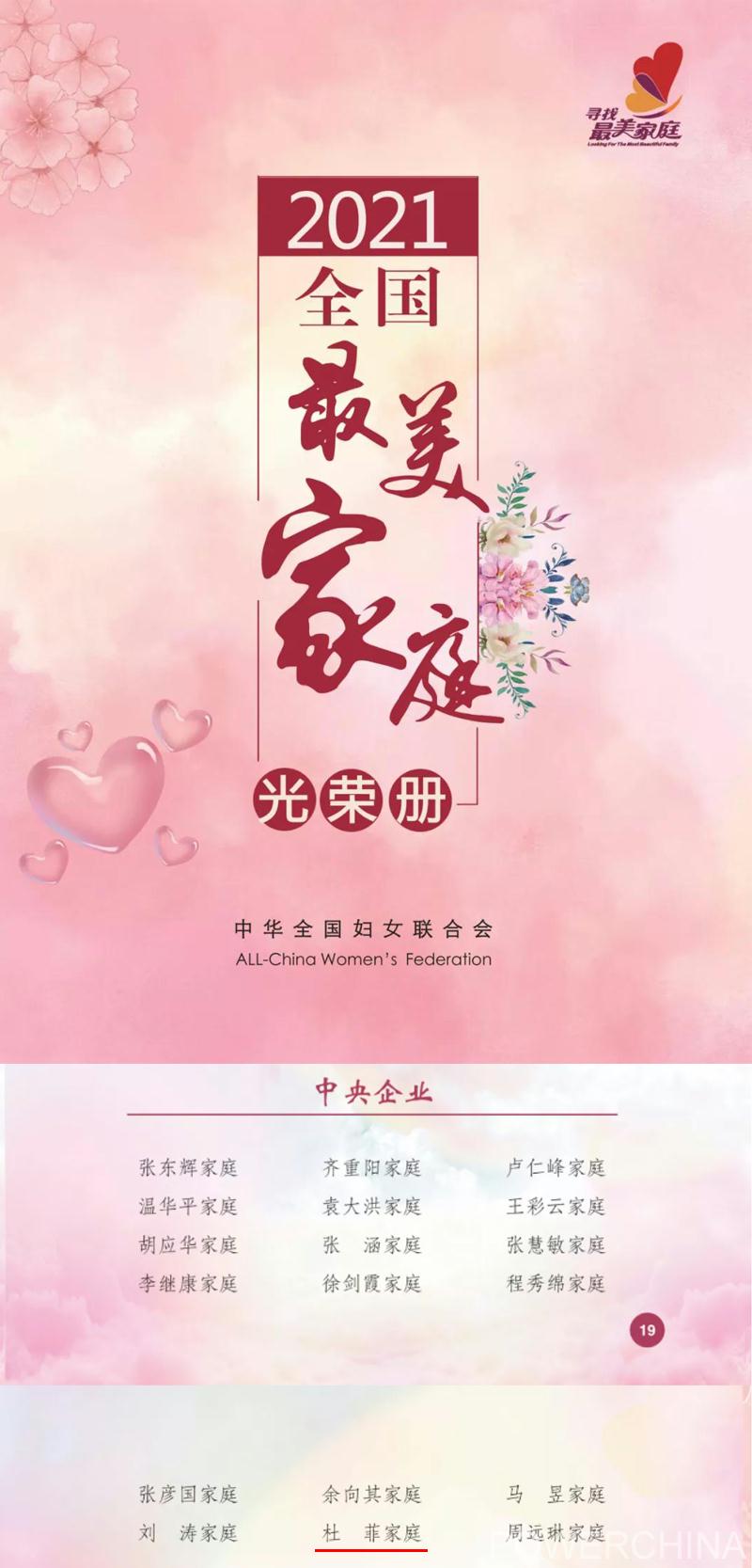 近日,由中共中央宣传部、中央文明办、全国妇联主办的加强家庭家教家风建设工作推进会在嘉兴举行,全国人大常委会副委员长、全国妇联主席沈跃跃出席并讲话。会上,揭晓了2021年全国“最美家庭”,来自中国电建的杜菲家庭名列其中。
