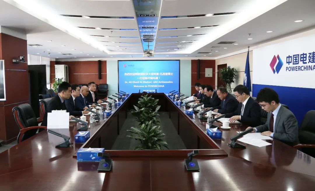 丁焰章对大使一行的到访表示热烈欢迎,感谢大使阁下对中国电建的关心和支持,并对阿联酋建国50周年致以热烈的祝贺。丁焰章表示,中阿两国合作基础深厚,合作领域广泛,涉及能源电力、基础设施、大数据、人工智能、旅游合作、疫苗合作等。阿联酋一直是共建“一带一路”的拥护者支持者,也是中国电建在中东北非地区的重要国别市场。中国电建非常荣幸能够参与阿联酋国家的经济社会发展建设,十分愿意与阿联酋有关部门、企业继续深化合作,创新商业模式,培育合作新增长点。