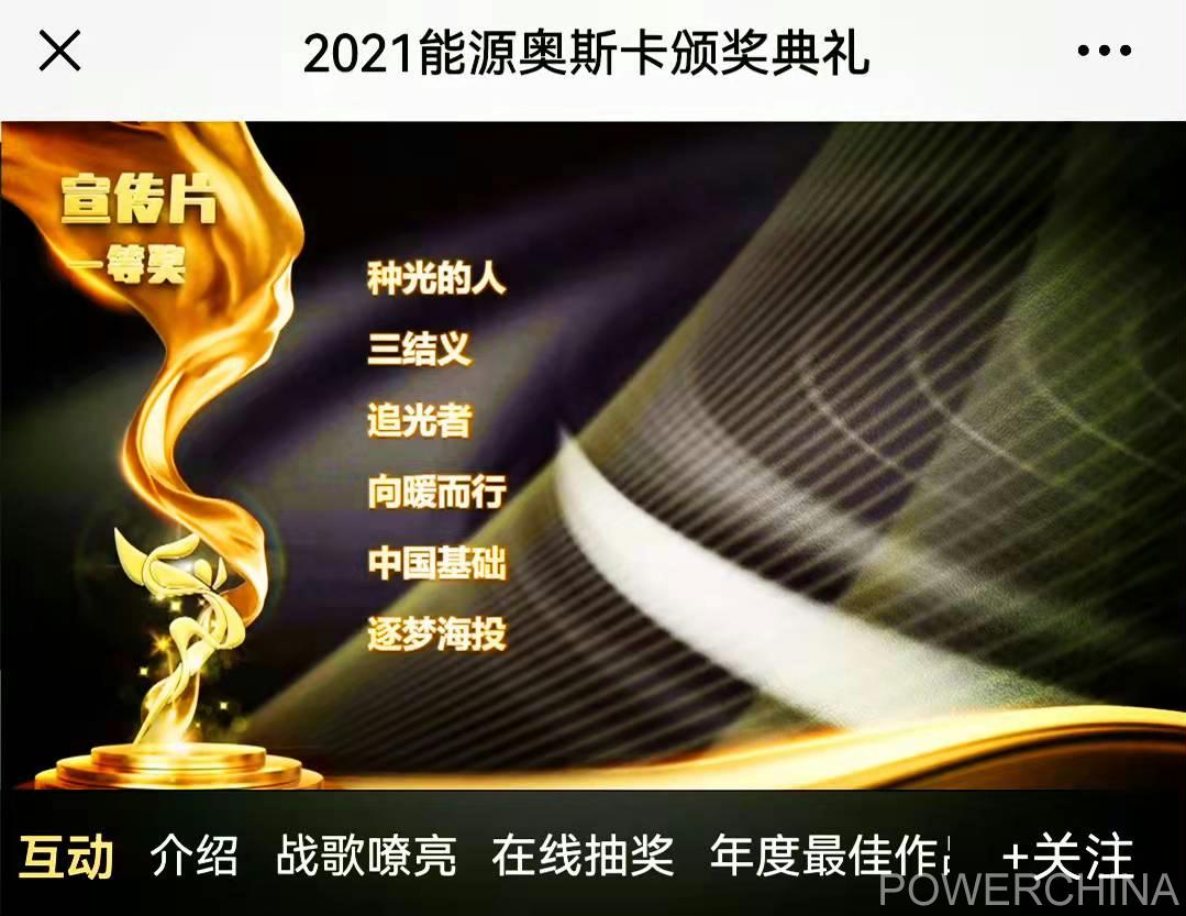 12月20日, 2021“能源奥斯卡”全国能源行业优秀影视作品展评及2020 年度“中国电力新闻奖(影视)”作品颁奖典礼以线上视频形式举行,公司报送的2部作品获一等奖,2部作品获二等奖。其中水电基础局《中国基础》、电建海投公司《逐梦海投》获得宣传片一等奖、水电十一局《力行者》获的宣传片二等奖;成都院《大坝无言》获综合专题二等奖。