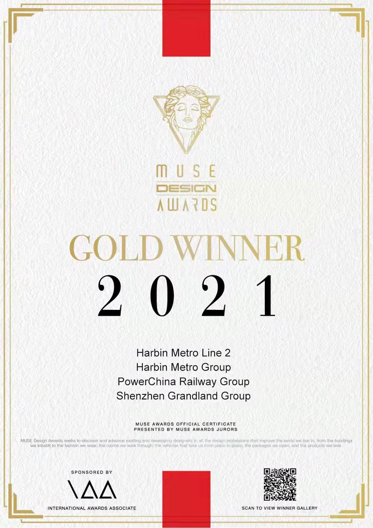 缪斯设计奖(Muse Design Awards)是一项国际性大赛,由国际奖项协会International Awards Associates(IAA)主办,历史悠久,含金量高,旨在发掘和表彰建筑、室内、时尚等六大设计领域的杰出者,以严格的评审体系和高质量的评判标准著称,每年吸引众多全球知名品牌与设计师争相参与。哈尔滨地铁2号线项目在众多竞争作品中脱颖而出,获得设计类金奖。