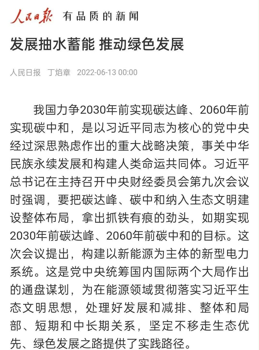 6月13日,公司党委书记、董事长丁焰章在《人民日报》发表署名文章《发展抽水蓄能 推动绿色发展》,为公司新阶段抽水蓄能业务描绘出了“作战图”,各单位在“抢”字上发力,积极与地方政府高端对接,以抽水蓄能项目为主线,通过签订战略协议或投资开发协议,统筹谋划“风电、光伏、抽蓄”一体化清洁能源基地,提前锁定抽水蓄能建设项目资源。