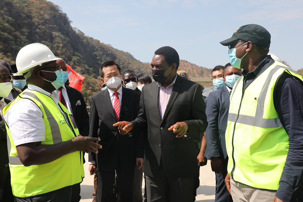 哈凯恩德·希奇莱马总统一行参观了运营村、大坝及厂房等重点施工部位,对现场的主要工程量、基本信息和施工进度进行详细了解和询问,并与当地员工亲切交流合影,对中国电建的履约能力给予高度评价。哈凯恩德·希奇莱马总统对中国国家主席习近平和中国人民对赞比亚坚定不移的支持表示感谢。他强调,赞比亚需要通过像下凯富峡水电站这样的工程来促进国家的发展,这也是绿色能源发展的里程碑,中国水电承建的伊泰兹水电站等都是绿色能源发展的典范。他对中国水电出色的履约能力及中赞职工的不懈奋斗表示感谢。他指出,下凯富峡项目实际产生的效益要远远高于其合同额,国家需要更多的行动来重振经济和提高人民生活水平。